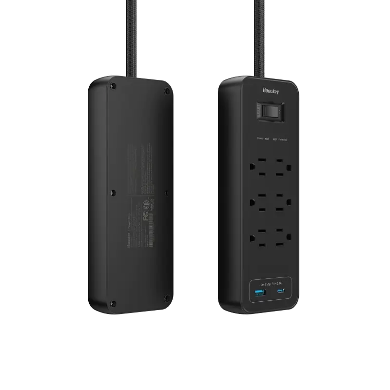 Contemporary offices utilize a blend of traditional and USB-powered equipment. These Huntkey power strips address this hybrid need through their outlet configuration. The design includes six AC outlets for standard plugs and two USB ports—one USB-C and one USB-A—offering a combined 12W output. This allows for the simultaneous operation and charging of computers, peripherals, and mobile devices from a centralized point, simplifying cable management.